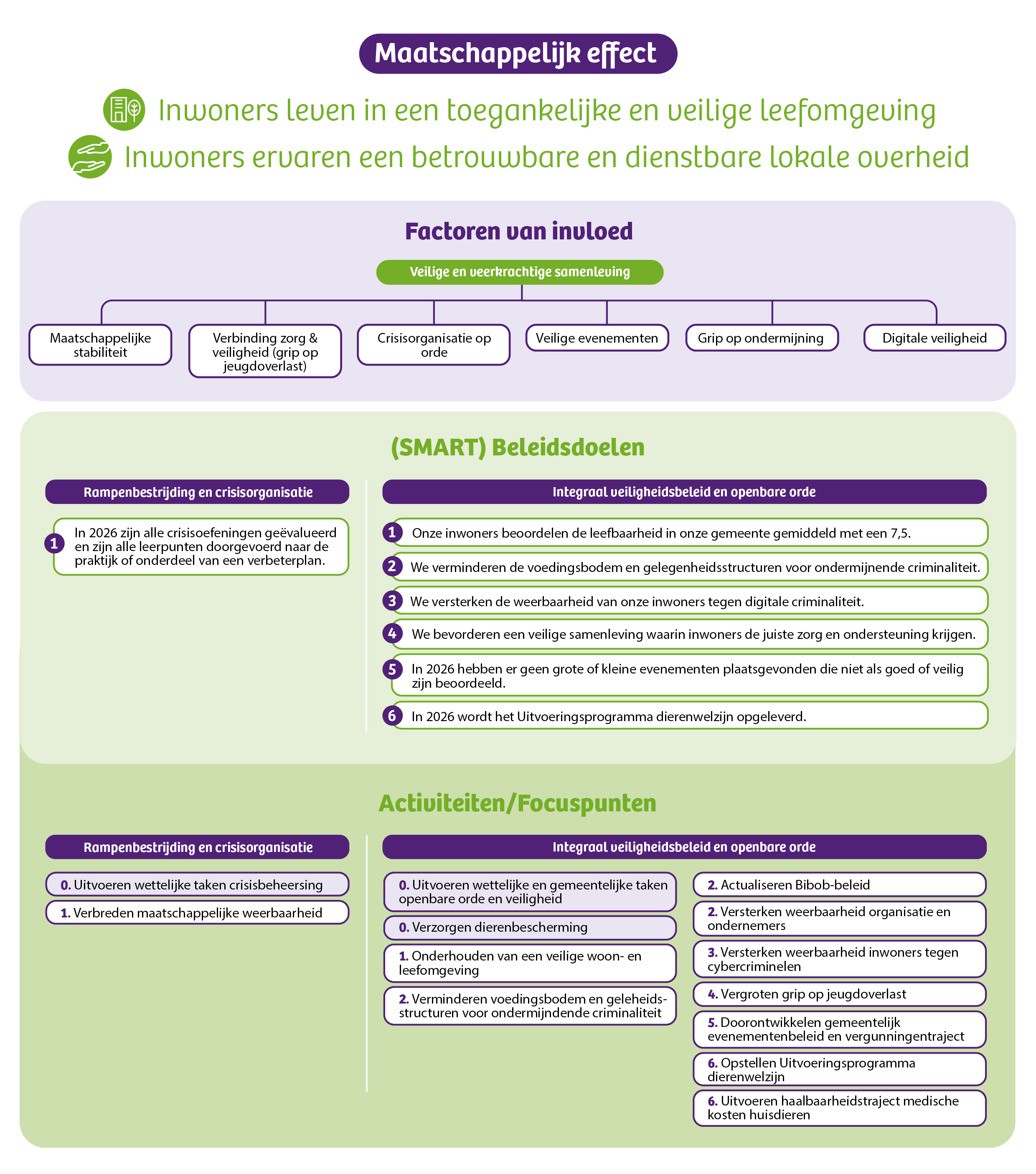 Terug naar navigatie - Programma 1 Veiligheid - Programma inleidingHet maatschappelijk effect wat we nastreven is dat onze inwoners wonen in een toegankelijke en veilige leefomgeving en een betrouwbare, dienstbare lokale overheid ervaren. Sociale cohesie speelt hierin een sleutelrol, omdat het wederzijds begrip, veiligheid en welzijn versterkt. Door proactief maatschappelijke ontwikkelingen te signaleren en hierop bij te sturen, bouwen we aan een toekomstbestendige gemeenschap. Samenwerking met partners, zoals de Veiligheidsregio Flevoland (VRF), is daarbij essentieel om effectief en daadkrachtig te handelen.