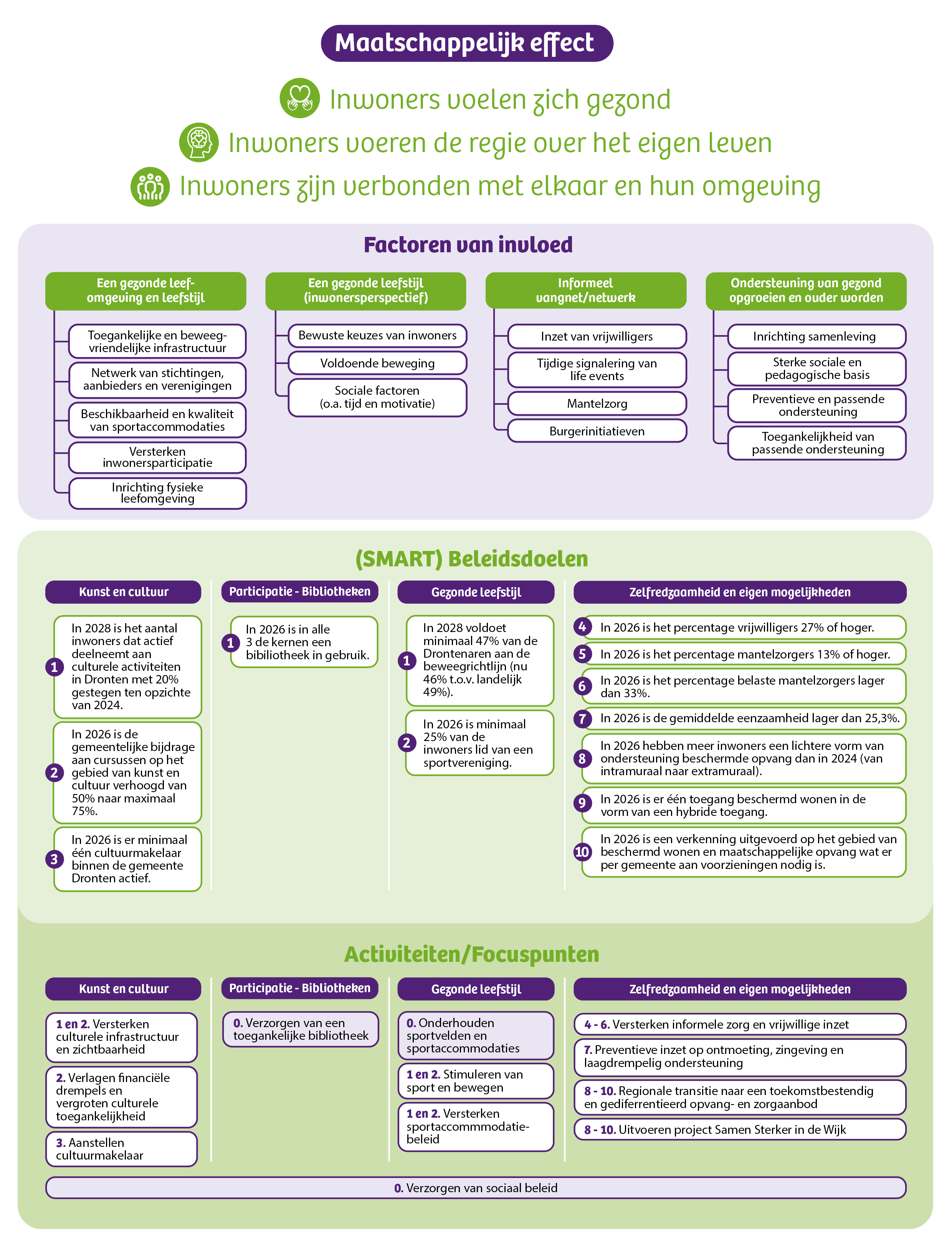 Terug naar navigatie - Programma 5 Sport, cultuur en recreatie - Programma inleidingHet maatschappelijke effect wat we nastreven is dat onze inwoners zich gezond voelen, de regie voeren over het eigenlijk leven en verbonden zijn met elkaar. Een gezonde, actieve en betrokken gemeenschap is hiervoor essentieel.