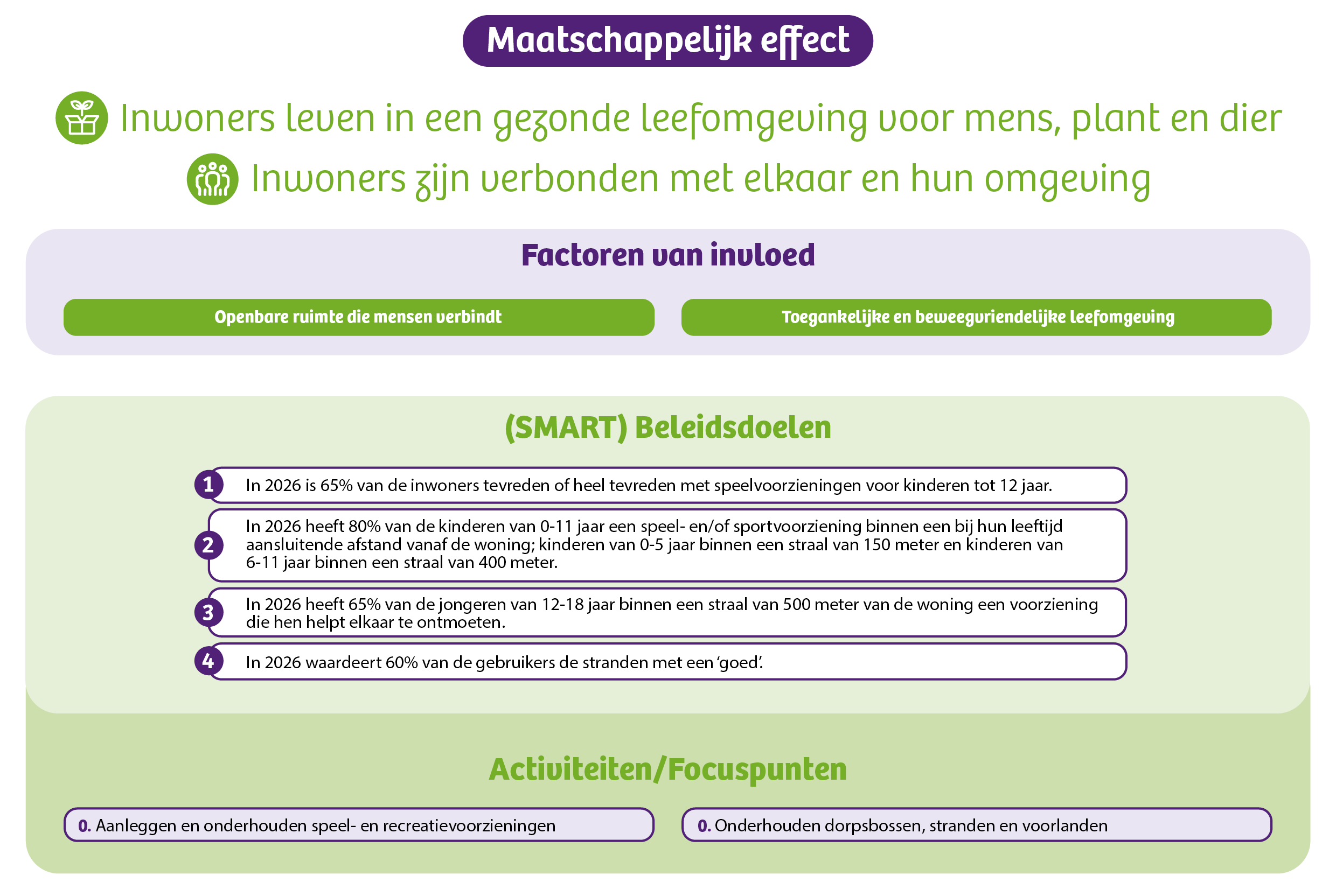 2) In 2026 heeft 80% van de kinderen van 0-11 jaar een speel- en/of sportvoorziening binnen een bij hun leeftijd aansluitende afstand vanaf de woning; kinderen van 0-5 jaar binnen een straal van 150 meter en kinderen van 6-11 jaar binnen een straal van 400 meter.