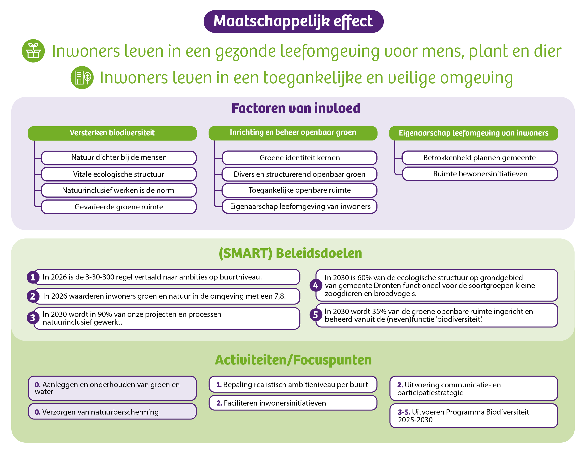 Terug naar navigatie - Pakket 5O Gezonde leefstijl - InhoudWe streven ernaar dat inwoners zich gezond voelen, regie voeren over het eigen leven en leven in een gezonde leefomgeving voor mens, plant en dier. Bewegen draagt bij aan een gezonde leefstijl en een positieve gezondheid. De focus ligt op het aanbod van sport- en beweegmogelijkheden in Dronten (sportaccommodaties, sportverenigingen, fysieke leefomgeving en ongeorganiseerd beweegaanbod). De gemeente Dronten streeft naar een gezonde sport-, beweeg- en leefomgeving, met aandacht voor de diverse leefstijlinterventies. Vanuit dit pakket wordt hieraan bijgedragen door sport fysiek mogelijk te maken (accommodaties) en deelname te stimuleren. Binnen de begroting richten we ons in andere pakketten op verschillende factoren die van invloed zijn op deze maatschappelijke effecten. Zo is pakket 7O gericht op het voorkomen van roken, vapen en alcoholgebruik. Vanuit de fysieke leefomgeving is in pakket 5J de focus gericht op de kwaliteit en nabijheid van speel- en sportvoorzieningen.