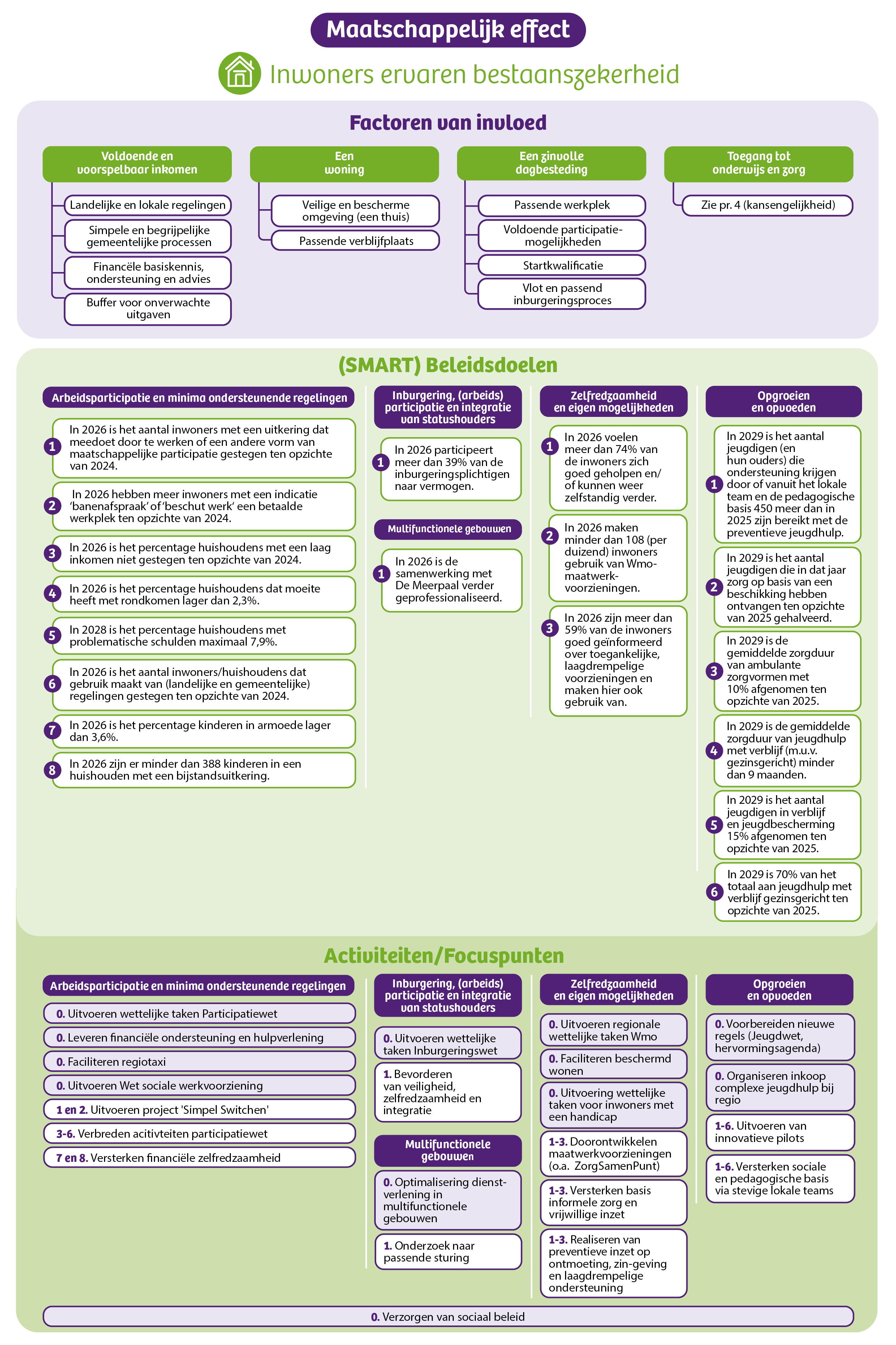 Terug naar navigatie - Programma 6 Sociaal domein - Programma inleidingHet maatschappelijke effect wat we nastreven is dat inwoners bestaanszekerheid ervaren. Dit programma richt zich op het waarborgen van bestaanszekerheid. In combinatie met de groeiopgave waar de gemeente voor staat, is het daarom van belang om in te spelen op maatschappelijke veranderingen. Sociale cohesie staat hierin centraal. De focus ligt daarom op het versterken van een inclusieve en veerkrachtige gemeenschap, waarbij continu wordt ingespeeld op de veranderende behoeften van de inwoners, bijvoorbeeld als gevolg van een bevolkingssamenstelling die altijd in ontwikkeling is.